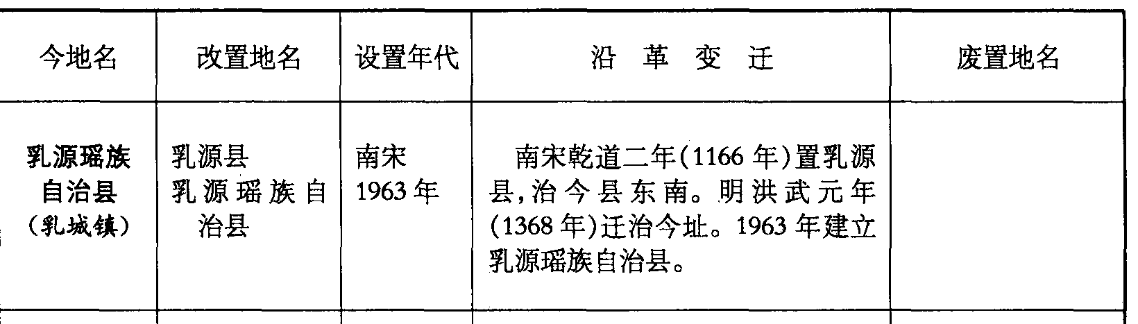 乳源瑶族自治县(乳城镇)乳源县乳源瑶族自治县南宋1963年南宋乾道二年(1166年)置乳源县,治今县东南。明洪武元年(1368年)迁治今址。1963年建立乳源瑶族自治县。