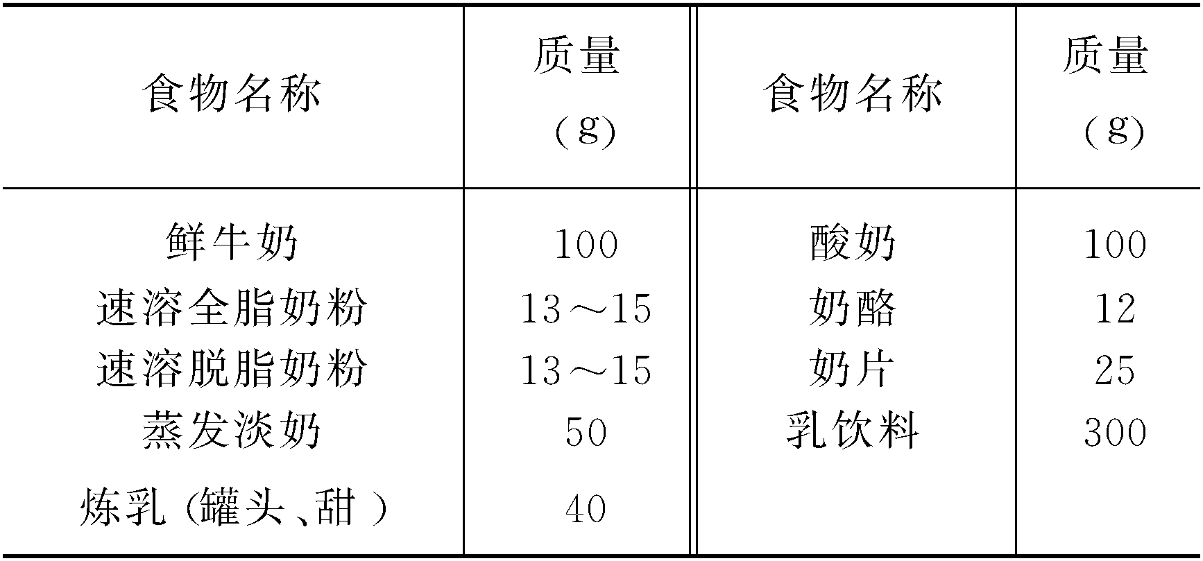 乳类食物互换表(相当于100 g鲜牛奶的乳类食物)