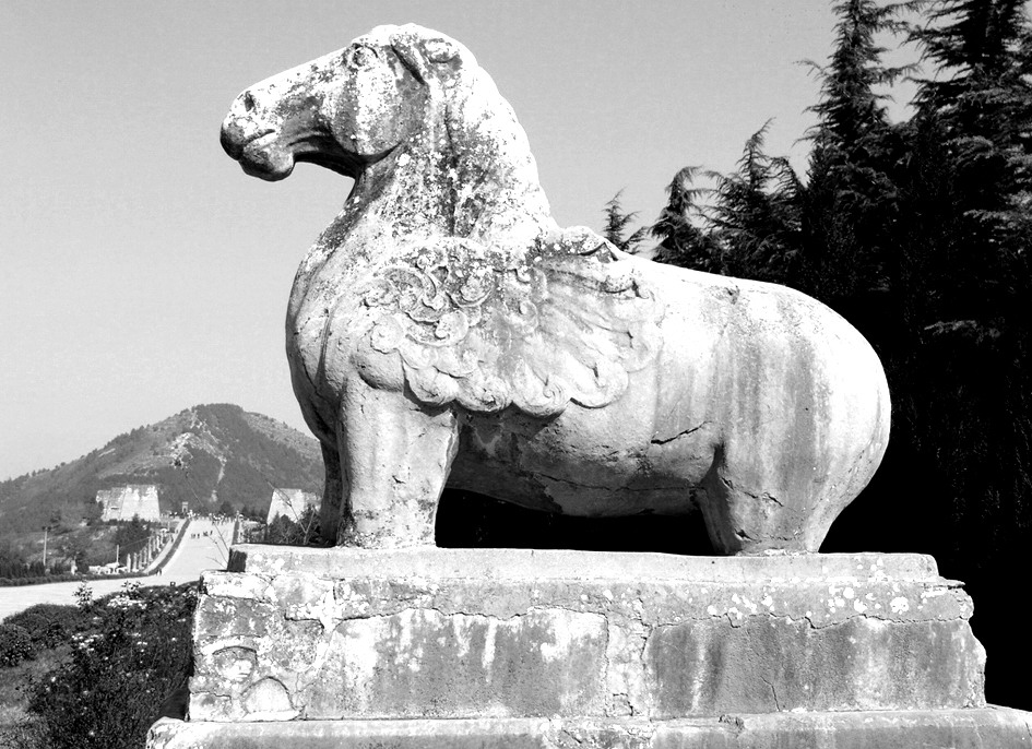 唐代。1对,置于乾陵司马道。唐睿宗文明元年(684)前后刻。圆雕。高317厘米,长280厘米。为神话传说中的神马。马昂头站立,圆目直视,颈项两侧分披鬃毛,翼卷曲。颈和腿都较粗短。腹下透雕。翼面重叠转折,双翼展于前肢上部,刻浮雕云纹,有腾云驾雾之势,形神兼美。翼马四足和尾与石座相连,石座四周线刻各种纹饰。