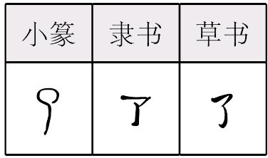 《说文》:“从子,无臂,象形。”本义为束缚婴儿的两臂。“无臂”也可理解为:“子”去左边为“孓”,去右边为“孑”,左右全无为“了”,本义为讫也,毕了。“了结”用此义。也有学者认为像风钩。(陈政《字源谈趣》337页)假借为“瞭(了)解”的“了”。作声符生成的字有: