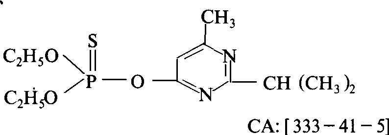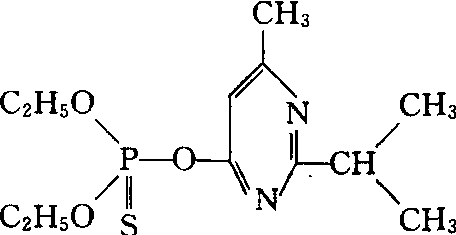 性能 纯品为无色油状液体,50℃以上不稳定,120℃以上分解。对光照稳定,易被氧化。在碱性介质中稳定,在水溶液中或弱酸性介质中缓慢水解,强酸或强碱条件下迅速分解。贮存时微量的水能促使水解。不溶于水,20℃时溶解度40毫克/升,易溶于一般有机溶剂。对高等动物较低毒,大白鼠急性口服LD50 285毫克/千克; 急性经皮LD50 455毫克/千克(雌)、900毫克/千克(雄)。可通过人体皮肤被吸收。在试验动物体内易于被降解与排泄。对鱼类低毒,对鸭、鹅高毒,对蜜蜂高毒。对害虫具有触杀、胃毒,熏蒸作用,有一定杀螨活性及杀线虫活性。残效期较长。 应用 主要以乳油对水喷雾用于水稻、棉花、果树、蔬菜、甘蔗、玉米、烟草、马铃薯等作物,防治刺吸式口器害虫和食叶害虫,如鳞翅目、双翅目幼虫、蚜虫、叶蝉、飞虱、蓟马、介壳虫、二十八星瓢虫、锯蜂等及叶螨,对虫卵、螨卵也有一定杀伤效果。小麦、玉米、高粱、花生等拌种,可防治蝼蛄、蛴螬等土壤害虫。颗粒剂灌心叶,可防治玉米螟。乳油对煤油喷雾,可防治蜚蠊、跳蚤、虱子、苍蝇、蚊子等卫生害虫。绵羊药液浸浴,可防治蝇、虱、蜱、蚤等体外寄生虫。一般使用下无药害,但一些品种的苹果和莴苣较敏感。收获前禁用期一般为10天。不能和铜制剂、除草剂敌稗混用,在施用敌稗前后2周内也不能使用。制剂不能用铜器、铜合金器或塑料容器盛装。 二嗪磷diazinon又称地亚农、二嗪农。广谱有机磷杀虫剂。化学名称:O,O-二乙基-O-(2-异丙基-4-甲基嘧啶-6甲基)硫逐磷酸酯。化学结构式如下。纯品为无色、无臭油状液体,沸点83~84℃(266.6×10-4 Pa),密度1.116~1.118,蒸气压186.7 ×10-4 Pa。常温下水中溶解度为40 mg/kg,可与乙醇、丙酮、二甲苯混溶,在水或稀酸中逐渐分解,在稀碱中稳定,在强碱中很快分解,挥发性强。对害虫和螨类具有很强的触杀、胃毒作用和较好的熏蒸作用,对一些害虫有杀卵作用。渗透作用较强。速效,叶面喷雾药效期较短,但在土壤内,药效期长。可应用于水稻、甘蔗、玉米、棉花、蔬菜、果树、烟草、花卉等,防治食叶害虫、钻蛀性害虫、刺吸口器害虫及地下害虫。对大鼠急性口服LD50为250~285mg/kg,急性经皮LD50为455~900 mg/kg,吸入急性LC50为3.5 mg/L(4h)。ADI值为0.002 mg/kg。日本规定稻米、大豆、果实、茶、蔬菜上的允许残留量为0.1 mg/kg。