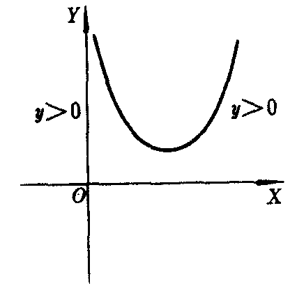 图5 如果△=0,方程ax2+bx+c=0有两个相等实根x1=x2=-b/2a,抛物线y=ax2+bx+c与X轴只有一个交点(如图4),那么,不等式ax2+bx+c>0的解集是所有不等于-b/2a的实数.而不等式ax2+bx+c<0的解集是空集;如果△<0,方程ax2+bx+c=0无实根,抛物线y=ax2+bx+c与X轴没有交点(如图5),那么,不等式ax2+bx+c>0的解集是全体实数.而不等式ax2+bx+c<0的解集是空集.☚ 直线型经验公式 二次函数的最大值和最小值 ☛ |
