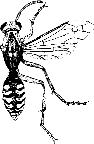 图2 拖脚蜂雌性成虫 及工蜂死亡,雌蜂在树洞或石缝处越冬。为害 该蜂为杂食性,春季取食花蜜和植物茎叶的汁液,对蜜糖有一定的趋性;夏秋季以肉食为主,捕食鳞翅目幼虫。柞蚕是该蜂最喜食的一种食物。每年7月中旬到8月中旬,为1化和2化秋蚕1~3龄期,是二纹长脚蜂捕食盛期。二纹长脚蜂捕食柞蚕时,先落到蚕的侧面,用大颚咬破蚕体拖走,自己吃掉或嚼成肉团抱回巢喂养幼虫,高温干旱年份为害较重,有时在几天之内能把蚕场里的柞蚕全部吃掉。 防治 雌蜂在春季有集中取水和喝水的习性,利用自然水坑或人造水坑上盖枯枝草叶,连续几个晴天以后,选择温暖无风的天气,上午9时左右,向水坑里投放浓度在1%上下的敌百虫,一天之内可将附近的雌蜂杀死80%以上。 |