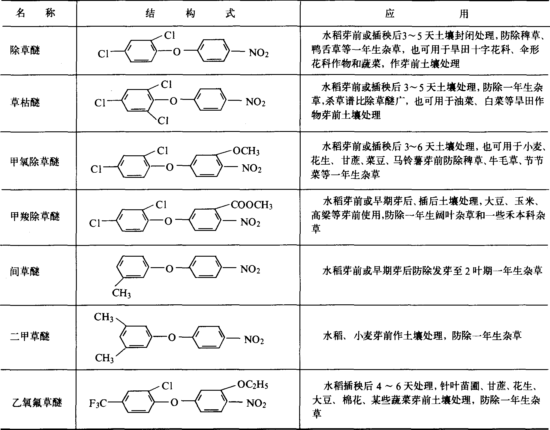 1963年美国罗门 —哈斯公司(Rohm & HaasCo.)首先开发除草醚,其后1965年日本三井东压公司开发了草枯醚等。1965年除草醚在日本登记用于水稻田除草,70年代成为日本除草剂的最大品种,1980年后因慢性毒性而停止销售。甲氧除草醚等品种使用面积逐渐扩大。70年代以来相继研制出若干高活性的含氟二苯醚新品种如乙氧氟草醚、三氟羧草醚、氟磺胺草醚、克阔乐等单位面积用量减少,并扩大到旱田多种作物的使用。 性能 对哺乳动物及鱼贝类低毒。大多数品种在杂草萌芽前及萌芽初期土壤处理,被植物迅速吸收,传导性很差或不传导,主要起触杀作用,防治杂草幼芽有特效,敏感植物接触药剂,表皮细胞遭破坏,产生坏死褐变,对光合作用中的氧化磷酸化作用产生严重抑制,干扰ATP(三磷酸腺苷)引起无氧呼吸,同时透过角质层。虽然植物各部都能吸收药剂,但接触药剂部位不同,表现出来的药效差异很大。杂草幼芽接触药剂时,受害最重,而种子及根部吸收药剂时除草效果较小。对阔叶杂草的效果优于禾本科杂草。因水溶度低,施入土壤后可被土壤胶体强烈吸附,故淋溶性小,不易移动。二苯醚类大多数品种都是稻田土壤处理剂,施于土表封闭,不需混土,否则破坏药层使药效降低。由于大多数品种在植物体内不易传导,因而在使用中,即使引起作物伤害也是局部性药害,生长易于恢复。多数品种可通过动物、植物、微生物、日光等作用,发生硝基还原、醚键裂解、环裂解、脱氯等反应而分解,在土壤中微生物作用下均生成无除草活性的氨基衍生物,在旱田分解极缓慢,在淹水土壤中分解迅速,一般持效期中等。 分类 根据除草活性与光的关系可分为两类: ❶光相关类。即在光下才能产生除草活性的除草剂。邻位取代的品种在第一个苯环的邻位上至少有一个取代基,此取代基以—Cl为多,其次—F、—NO2、—CH3等,后一个苯环上通常含对-硝基,其次对-Cl、对-CN,这类品种都是2、4或2、4、6位取代的化合物,而2、4、5取代的化合物无活性。邻位取代品种都具有光活化作用,而在黑暗中则无活性。如除草醚、草枯醚、甲羧除草醚、乙氧氟草醚等。 ❷非光相关类。在光下或黑暗中均有除草活性的除草剂。间位取代的品种,多为3-位或3、5-位取代的化合物,在光下或黑暗中均有除草活性,因而对幼芽和幼根都产生显著毒害作用,如甲草醚、二甲草醚等。如按施药部位可分为三类: ❶土壤处理剂。作物播种后芽前或苗前施于土表,或作物出苗后施于土表,抑制或杀死正在萌发的杂草,如除草醚、甲羧除草醚等。 ❷茎叶兼土壤处理剂。既可用于作物芽前,作土壤处理抑制和杀死刚萌动的杂草,也可在作物生育期作茎叶处理如氟磺草醚、乙氧氟草醚等。 ❸茎叶处理剂。作物苗后作茎叶喷雾处理,如氟磺草醚、克阔乐等。 二 苯 醚 类 主 要 品 种