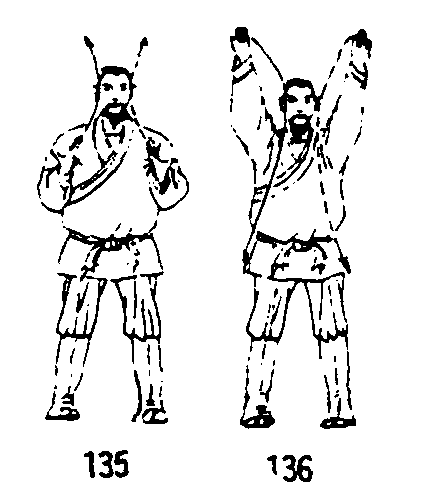| 释义 | 二龙吐须 二龙吐须四十九式经络动功第3段“导气”动作之九(全套动作顺序第三十一式):随着吸气,提肛调裆;两掌经腋下向脑后直上伸出,掌心朝后,两臂伸直呈双龙吐须状;同时脚跟拔起;眼平视前方。(图135、136)要点:百会上顶,身体中正,脚跟尽量提起,脚趾似入地生根。