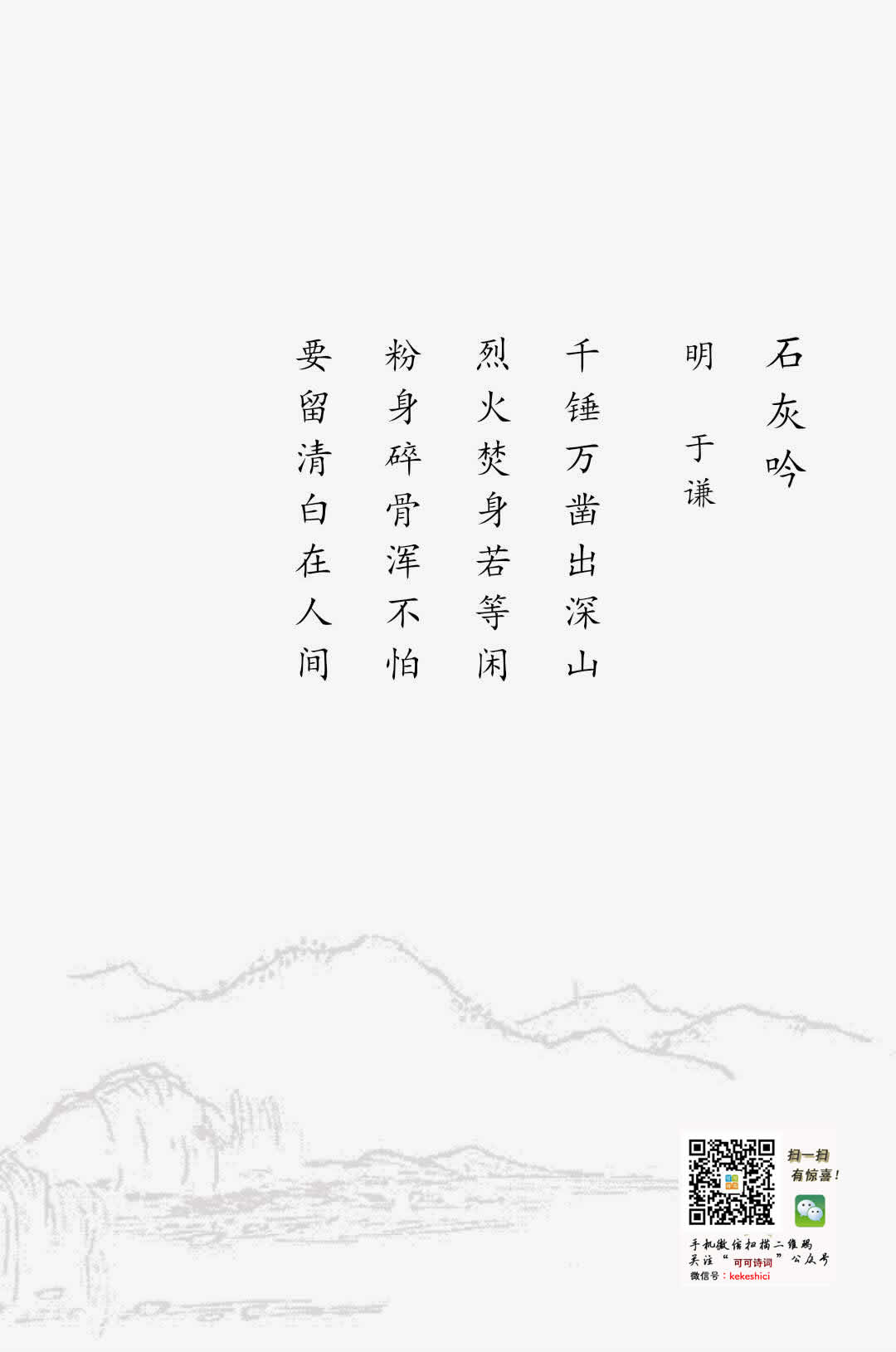 这是一首喻体小诗,有的版本全诗作:“千锤万击出深山,烈火焚烧若等闲。粉身碎骨全不怕,要留清白在人间。”此诗相传为于谦十多岁时所作。古人写诗往往讲究寄托,即将自己的情感寄寓于某种事物的描写之中。“托物喻志”是我国诗歌的传统手法,《石灰吟》正是此类作品,字面上四句诗都是写石灰,实际上语语双关,写得十分精巧,毫无雕琢感。所描写的事物与所表现的思想情感丝丝入扣,十分贴切。 首句是写石灰石从深山中被开采出来。“千锤万凿”描写了开采过程中石灰所受的磨难。石灰本无生命,但在于谦笔下被赋予了生命,带有强烈的感情色彩。石灰石从深山来到世间,“出”字也带有主动出世的意味。第二句是说石灰石变成石灰所经过的焙烧过程,“若等闲”同样带有强烈的情感色彩,是充满生命感的描写。这比第一次的磨难更为酷烈,石灰毫不畏缩退避,反映了石灰崇高的献身精神。这里的石灰已不仅仅是一种物质,而是一个闪光的象征形象了。后两句继续写石灰的生产过程,“粉身碎骨”是指石灰石经过焙烧,变成粉末状的石灰,然后,最终被人们用之于粉刷建筑物等,在人间留下一片清白之色。“粉身碎骨”是一种比脱胎换骨更为酷烈的磨难。但是对待这种磨难,它却同样处之泰然。因为石灰抱定宗旨:“要留清白在人间”,造福于人,不惜毁灭自己,是它唯一的追求。无私才能无畏,石灰彻底的无私,使得他不怕任何磨难,心地坦然地去承受最严峻的考验。寥寥二十余字,一个高度人格化的石灰形象就刻划成功了。 《石灰吟》写石灰的一生,实际上是于谦的自我表白,含意深长,作者借对石灰的衷心赞美,表达了自己的志向,自己的人格追求,表明自己也愿象石灰一样,怀着一颗赤诚无私的心,处之泰然地忍受考验,对待种种人间磨难,造福于人类,唯愿留下清白之名。 历代象这类托物喻志的诗歌很多,但象《石灰吟》这样既字字紧扣所咏的事物写,又语语双关,隐含比喻,丝毫不露痕迹地表达自己的情感却不可多得。作者善于抓住事物的典型特征——经受磨难和留下“清白”。他另有一首诗《咏煤炭》。煤炭是黑色的,诗人突出煤炭不惜烧尽自己,为人们献出光和热的典型特征,同样歌颂献身精神,也写得非常贴切,说明作者善于运用托物喻志的技巧,来抒发自己高尚的志向。 |
