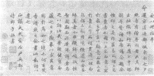 明。纸本。纵28.9厘米,横61厘米。北京故宫博物院藏。于谦(明洪武二十七—明景泰四年,即公元1394—1453年),字廷益,钱塘(今浙江杭州)人。永乐19年(公元1421年)进士。宣德初授御史,以才迁兵部右侍郎,巡抚河南、山西达十九年。正统间召为兵部左侍部并升任兵部尚书。时也先入侵,于谦亲自督战却之,论功加少保,总督军务。后被诬弃市。赠太傅。著有《于忠肃集》。工诗文,擅书法。这件作品是于谦为普朗和尚题其师所遗《公中塔图及赞语》。书法师赵孟頫,圆劲遒逸,骨力劲健。是于谦存世墨迹中的精品。