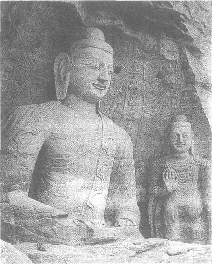 云冈第20窟大佛 原石窟外均有木构建筑,今已荡然无存。第20窟已完全露天,正中雕释迦坐像,着右袒袈裟,结跏趺坐。高13.7米,两侧雕二立佛,构图呈金字塔形,主像高大而突出。按照佛教教义,佛即觉,包括自觉、觉地、觉行圆满三层意思,为佛教修行的最高果位。雕凿这尊佛像的直接目的是为皇帝祈福。因此,追求神权与皇权的合 一,便成为它的主题。大佛高肉髻,方面大耳庄重威严而又面带慈祥,眉高修长,形如初月,双目炯炯有神,鼻高圆直,山根与额相通,显得智慧广大。口角微微上翘,似笑非笑,深沉含蓄。头稍前倾,目光下视,使人感到很亲切。背后身光、头光遍雕千佛及火焰纹,繁缛热烈,与主尊的威严、慈祥形成对比。 ☚ 莫高窟北魏彩塑佛像 麦积山童男童女 ☛ |