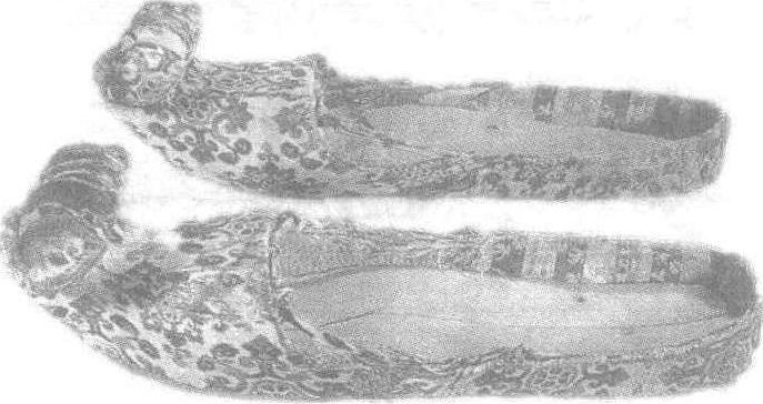 云头锦鞋 ☚ 花鸟纹锦 联珠双鹫纹锦袍 ☛ 云头锦鞋silk damask shoe with cloud pattern toe |