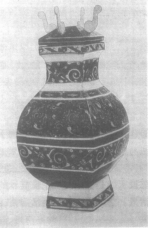 西汉。通高51.5厘米,口长、宽各13厘米。1972年湖南省长沙市马王堆1号汉墓出土。湖南省博物馆藏。钫即盛酒或粮食的方形壶,盛行于战国至西汉。此钫木胎、直口、平唇、鼓腹、圈足。盝顶形盖上,设四个“S”形橙黄色钮。内髹朱漆,表面在黑漆底上,用红、灰绿两色绘以鸟头、菱形纹、卷云纹、云气纹和“米”字形纹,颈、肩、腹、圈足上分别饰一条较宽的朱漆带,器外底部朱书“四斗”二字,圈足外有戳记,可惜字迹已模糊不可辨。马王堆1号汉墓计出土四件钫,形制、大小均相同,此为其中之一,出土时,内残存有酒类沉渣。经实测此钫可容酒7850毫升,平均每斗容196.25毫升。