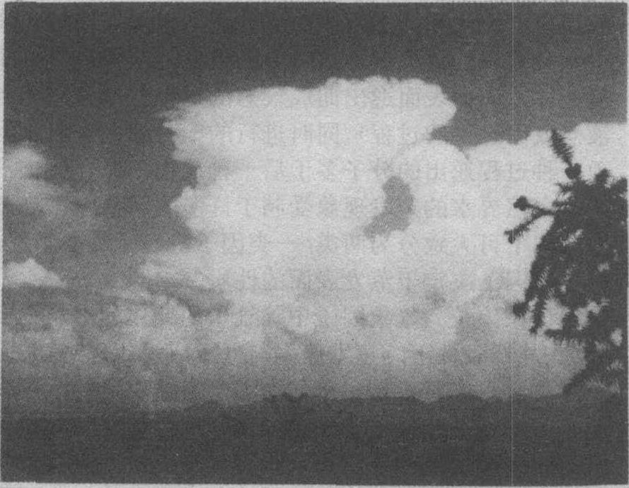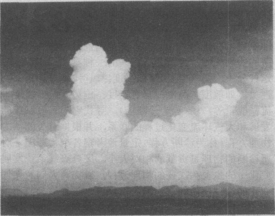 垂直发展的对流云,云底较低而云顶可以发展到对流层顶。图中示强对流云(浓积云→积雨云)在17分钟内的三帧图象。