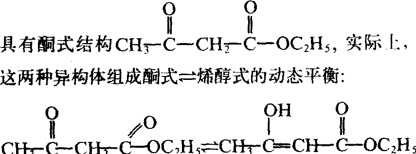 将乙酰乙酸乙酯溶于石油醚中,冷却至-78℃制得一熔点为-39℃固体 (n10D=1.225),它不使溴溶液褪色,与三氯化铁无颜色反应,具有酮的特征,证明为酮式异构体。如将乙酰乙酸乙酯的钠盐悬浮于石油醚中,于-78℃,通入氯化氢,则沉降出一液体(n10D=1.448),产物与上述者相反,它与三氯化铁产生紫红色,证明为烯醇式异构体。两种异构体的存在都得到证实,而且在常温下两者很容易相互转变,重新组成平衡混合物,不易分离,表现为一单纯的化合物。