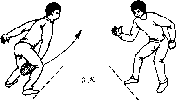 游戏方法 将学生分成若干小组, 每组2人,预备时,各组学生面对面成半蹲姿势,站在两条线后。其中一个人手拿沙袋,将沙袋置于两腿之间。教师发出开始口令后,握沙袋的同学将沙袋向下,向后摆过跨下,然后前摆上提脱手扔给对面同学, 对方接到沙袋做同样动作。这样往返抛接。最后以在规定时间内, 抛接次数最多的组为胜。