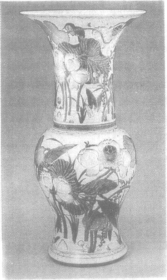 清康熙。高45.5厘米,口径22.9厘米。北京故宫博物院藏。康熙时期的五彩开始使用釉上蓝彩和黑彩。以蓝彩烧成的色调,其艳丽的程度超过青花。黑彩则浓重沉着,漆黑发亮。釉上蓝、黑彩的运用,结束了明代以来釉上、釉下结合的青花五彩占主流的状况。此外,金彩的运用,突破了明嘉靖时期在矾红、霁红等色地上描金的单一手法。此尊为喇叭形口,长颈,鼓腹,腹下部内敛,胫外撇,因形似凤尾,故又称凤尾瓶。以肩部为界,上下各绘一幅荷塘图。塘中有盛开和含苞待放的花朵,一些水草点缀其间,阵阵涟漪,荷叶轻摇,使画面极富写实意味。这饱富生机的荷塘,引来白鹭的安歇,翠鸟的驻足,彩蝶的流连。画工使用红、绿、紫、蓝、黑、金等色,潇洒自如地运笔,色彩浓淡相宜,清新俊逸,展现出令人心醉神迷的诗情画意。在一个端庄秀美而又别致的器物上,描绘出如此多彩多姿的景物,实为艺术家的杰作。不愧为康熙五彩器中的精品。