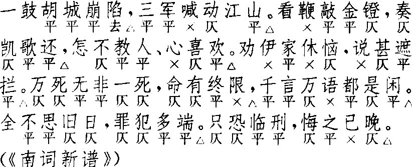 | 释义 | 五马江儿水 五马江儿水无名氏 《牧羊记》 ![]() 全曲十四句:4△,5△。4,4△,6△。4,4△。6,4△,7△。4,4△。4,4△。此曲极少用。《六十种曲》中,《精忠记·胜敌》一支,共十一句,第十句作五字。《寻亲记·惩恶》二支,每曲只八句,前五句相同。《南词新谱》谓:“按〔四朝元〕前五句,〔江头金桂〕前五句,〔二犯江儿水〕前五句,〔淘金令〕后七句,俱用此调,则此调极是古曲。旧谱不收,并其名而遗之。今查补。”〔五马江儿水〕虽极少用,但以它为主的集曲却不少,除《南词新谱》已举外,尚有〔五马摇金〕,计十四句:〔五马江儿水〕首至十,〔柳摇金〕十至末。见《南词简谱》。《玉环记·皋逢箫玉》〔五马江儿水〕一支,实为另一集曲,计十五句:〔五马江儿水〕首至十,〔朝元歌〕十至十一,〔柳摇金〕十一至末,较〔五马摇金〕多〔朝元歌〕二句,少〔柳摇金〕一句,可名为〔五马朝金〕。 ☚ 销金帐 二犯江儿水 ☛ 五马江儿水 五马江儿水曲牌名。属南曲仙吕入双调。字数定格及韵式,据清·周祥钰《九宫大成谱》作四、五、四、四、七、四、四、六、四、七、四、四、四、四(十四句)。由多人齐唱,以唢呐锣鼓伴奏,声势甚为雄壮,多表现行军出征的场面。 ☚ 江儿水 园林好 ☛ |