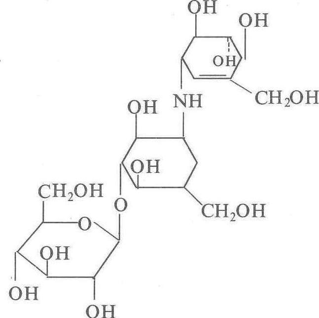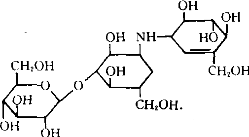 | 释义 | 井冈霉素validamycin A强内吸性,具选择作用的抗生素类杀菌剂。它是吸水链霉菌井冈变种产生的水溶性抗生素——葡萄糖苷类化合物。共有六个组分,其中井冈霉素A是最有活性的物质。其化学结构式: