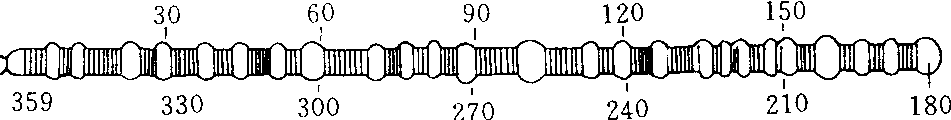 马铃薯纺锤形块茎类病毒PSTV的结构模型 拟病毒 包被于衣壳内的类似类病毒的拟病毒的大小为300~400核苷酸,有高度二级结构的单链共价闭合环状RNA分子。已知有4种病毒内含有拟病毒,即绒毛烟斑驳病毒(VTMoV)、莨岩斑驳病毒(SNMV)、苜蓿暂时性条斑病毒(LTSV)和地下三叶草斑驳病毒(SCMoV)。已把这4种病毒归为一个新的病毒组——绒毛烟斑驳病毒组。关于拟病毒RNA的功能,曾认为是侵染性所必需的,即其线状RNA和环状RNA共同存在才有侵染性,类似二分体基因组病毒。近年来证明线状RNA可单独侵染,而环状RNA的复制必须依靠线状RNA,类似病毒卫星RNA。拟病毒不但在二级结构上与类病毒有序列同源性。VTMoV,SNMV和 SCMoV的拟病毒与PSTV,CSV,CEV和CCCV等类病毒二级结构的中心区是同源的。 |