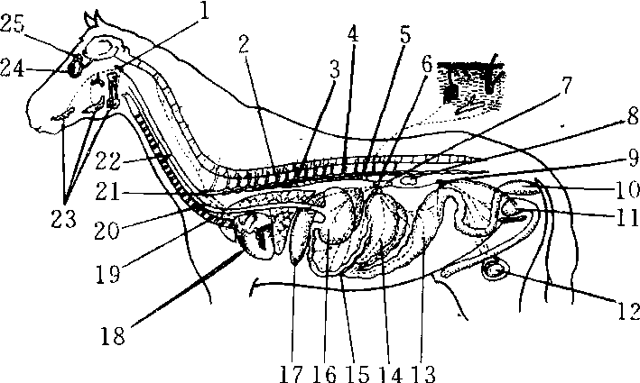 马的交感神经分布 (实线示节前神经纤维,虚线示节后神经纤维) 1.颈前神经节 2. 白交通支 3. 灰交通支 4. 交感神经干 5. 内脏大神经 6. 内脏小神经 7.腹腔肠系膜前神经节 8. 肾 9. 肠系膜后神经节 10. 直肠 11. 膀胱 12. 睾丸 13. 大结肠 14. 盲肠 15. 小肠 16. 胃 17. 肝 18. 心 19. 气管 20. 食管 21. 星状神经节 22. 颈部交感干 23. 唾液腺 24. 眼球 25. 泪腺 交感神经 交感神经jiaoganshenjing植物性神经的一部分。由中枢部、交感干、神经节、神经和神经丛组成。中枢部为交感神经的低级中枢,位于脊髓胸段全长及腰髓1~3节段的灰质侧角。成对交感干位于脊柱两侧,呈链锁状,由交感干神经节和节间支连接而成,每侧有22~25个神经节称椎旁节,可分颈、胸、腰、骶和尾5部分,各部发出分支至一定的器官。调节心脏及其他内脏器官的活动。在腹腔内,脊柱前方还布有椎旁节,分别位于同名动脉根部附近。交感神经系统的活动比较广泛,刺激交感神经能引起腹腔内脏及皮肤末梢血管收缩、心搏加强和加速、新陈代谢亢进、瞳孔散大、疲乏的肌肉工作能力增加等。交感神经的活动主要保证人体紧张状态时的生理需要。 ☚ 植物性神经 副交感神经 ☛ 交感神经sympathetic nerve系植物性神经的一部分。中枢部在全部胸髓和1~3腰髓的灰质侧角内。其周围部包括交感干、神经、神经节和神经丛。神经节又分为交感干神经节(椎旁神经节)和椎前神经节。交感神经分布的范围极广,除至胸、腹脏器外,遍及头颈各器官以及全身的血管和皮肤。交感神经功能为:作用眼球,开大瞳孔;作用腮腺、舌下腺、下颌下腺,分泌粘稠唾液;作用于心脏,心跳加速、冠状动脉扩张;作用于肺和支气管,扩张支气管;作用于肝、胆、胰,抑制腺体分泌;作用胃肠道(乙状结肠以上),蠕动减弱;作用于乙状结肠和直肠,抑制其蠕动,直肠内括约肌收缩;作用于膀胱,膀胱壁肌松弛、内括约肌收缩、尿潴留;作用于皮肤的血管、汗腺、立毛肌,则血管收缩、立毛、汗腺分泌。总之其功能与副交感神经相对抗。人体在正常情况下交感与副交感神经的功能处于平衡的制约中,一旦其某一功能异常则两者平衡便出现失调,临床可有各种异常表现。 交感神经植物神经系统的重要组成部分。由脊髓胸腰段侧角发出神经纤维,终止于交感神经节,再由此发出纤维分布到头、颈、胸和腹腔脏器,来调节器官和腺体的活动。但交感神经与副交感神经对同一器官的作用既互相拮抗,又互相统一,如当机体运动加强时,交感神经的活动加强,而副交感神经的活动减弱,于是出现心跳加快、血压上升、消化活动受到抑制等现象,同时机体代谢加强,能量消耗增加,相反,当机体处于安静或睡眠状态时,副交感神经的活动加强,而交感神经的活动减弱,则出现心跳变慢、血压恢复正常、消化活动增强,这样有利于体力的恢复和能量的贮存。 交感神经 交感神经植物性神经系统的一部分。交感神经元位于脊髓胸腰段的侧角内,其纤维由相应脊段发出终止于椎旁神经节或椎前神经节,称为节前纤维。节前纤维较粗,有髓鞘,进入神经节更换神经元后发出较长的节后纤维到达效应器官。椎旁神经节在脊柱两侧联合成两条交感神经链。节前纤维在离开脊髓后可能在交感链内上行或下行数节段,然后终止于神经节。一根节前纤维往往有许多分支,分别与不同节后神经元联系,产生“分散”兴奋的效果。同样,节后纤维也有许多分支分别支配效应器的不同细胞。在消化管中亦有一部分交感节后纤维并不直接支配效应器官,而是和消化管壁的神经丛中的节细胞发生联系。交感神经的作用与副交感神经相反,有使腹腔内脏及皮肤血管收缩、心跳加快加强、新陈代谢亢进、瞳孔散大、肠胃蠕动减弱的作用。 ☚ 脊髓 副交感神经 ☛ 交感神经sympathetic nerve |