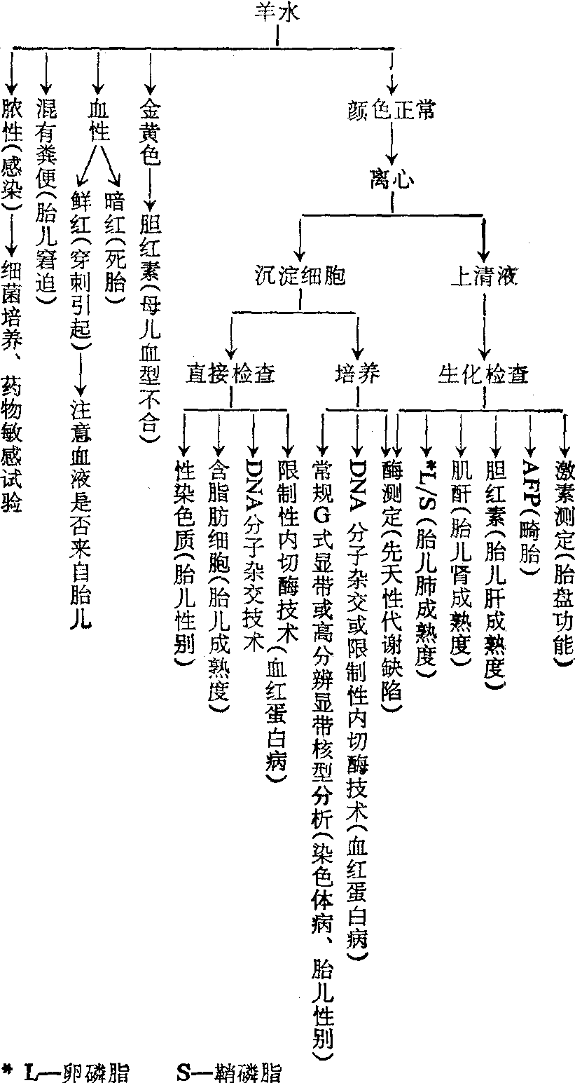 (2) 生化测定: 测定羊水中AFP、卵磷脂、鞘磷脂、肌酐、胆红素、氨基酸、激素等含量,了解胎儿各种脏器的成熟度,胎盘功能、畸形等情况。