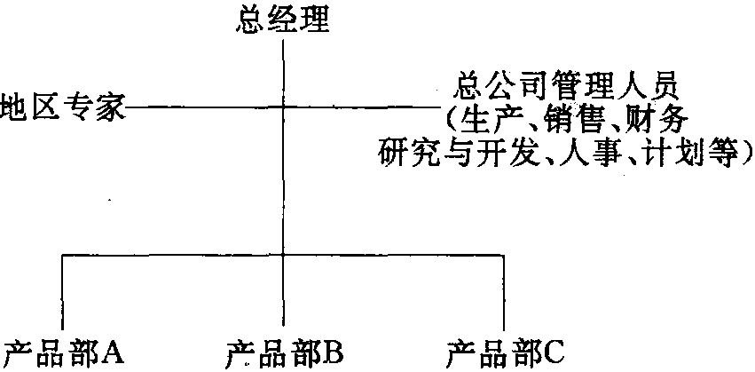在产品结构中,各产品分部经理负责该产品在国际市场上的经营。企业的经营目标由总部制订,据此产品部制订本部的经营计划。每个产品部都在以全球为目标市场的基础上负责对各自产品的经营与管理。产品部最适合于三种类型的企业:企业产品种类繁多;企业产品的最终用户市场之间存在着较大的差异;那些需要具备较高技术能力的企业。这种结构把经营的重点放在产品市场和技术诀窍上,并把全球作为目标市场。这种结构有利于一种产品在全球范围的竞争。目前这种组织结构的一个发展趋势是寻求对国际市场进行细分,并为这些市场设计出符合它们各自特点的新产品。这种结构最大的一个缺点是,一方面产品部的经理肩负着国际市场的经营责任,另一方面这些经理通常只具有大量在国内进行生产的专门知识,当那些只具有生产知识而不熟悉国际业务的人员派到产品部任主管时,他们往往不能适应国际市场经营的特殊要求。这种结构的另一个缺点是,很难在某一地区协调企业各产品部之间的事务。为克服产品部之间在协调和信息沟通方面存在的问题,一些企业在产品部的基础上加入国别管理体系。国别经理不对企业盈利负责,其主要职能是使各产品部能够了解它们在某一国家进行经营活动的情况。此外,这种结构还使企业总部过于重视国际市场机会,而忽视国内机会。产品部结构如下图所示: