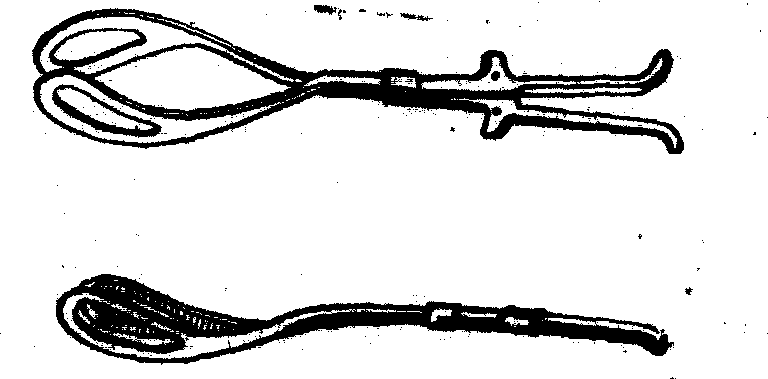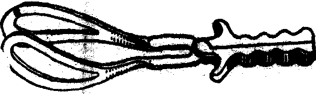 图1 Simpson产钳 Kielland产钳 为Kielland (1916)设计的一种较狭窄,类似刺刀形状,应用于旋转枕横位胎头的产钳。该产钳几乎无盆弯,每一钳柄上有一标记,以便了解产钳旋转的方向及程度(图2)。但用产钳旋转胎头,容易造成损伤。