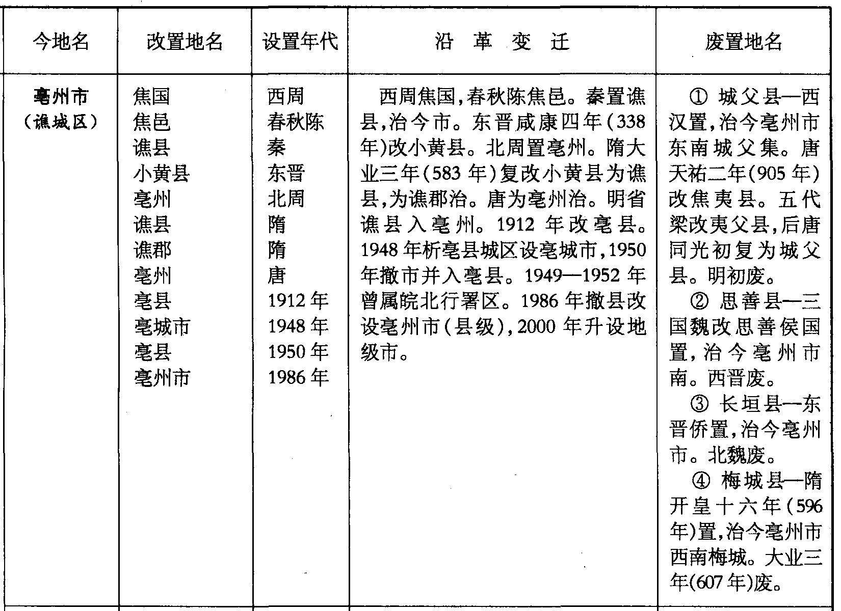 西周焦国,春秋陈焦邑。秦置谯县,治今市。东晋咸康四年(338年)改小黄县。北周置毫州。隋大业三年(583年)复改小黄县为谯县,为谯郡治。唐为毫州治。明省谯县入毫州。1912年改毫县。1948年析毫县城区设毫城市,1950年撤市并入毫县。1949—1952年曾属皖北行署区。1986年撤县改设毫州市(县级),2000年升设地级市。
