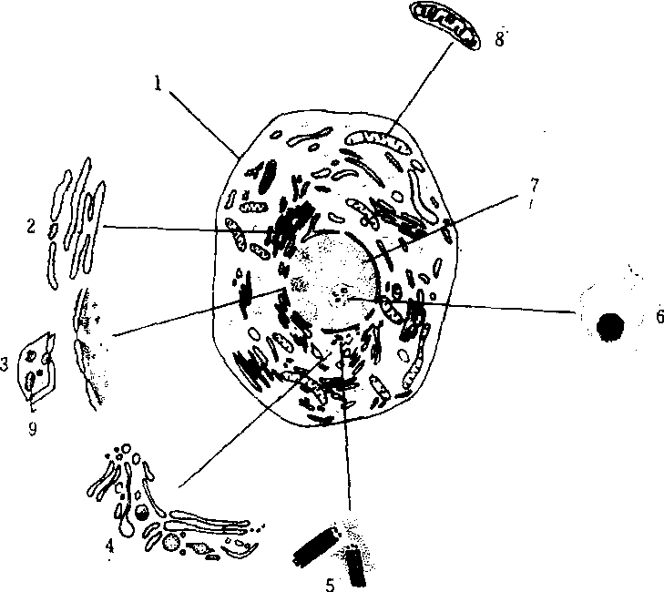1.细胞膜 2.内质网 3.核膜 4.高尔基器 5.中心体 6.核仁 7.细胞核 8.线粒体 9.核孔 细胞结构模式图 根据形态和功能的不同,人体组织可分为上皮组织、结缔组织、肌肉组织和神经组织四大基本类型。上皮组织由上皮细胞与少量的细胞间质组成,覆盖于机体外表面或体内一切管道、囊腔的内表面(如消化道,呼吸道、血管,胸膜腔等)。具有保护,吸收和分泌等功能;结缔组织是体内分布最广、种类最多样化的组织,其特点是细胞间质多,并分为纤维和无定形基质,细胞数量少,种类多。具有支持、连接、营养、防御、修复和运输等机能。包括疏松结缔组织、致密结缔组织、网状结缔组织、脂肪组织、软骨和骨组织、血液和淋巴液等;肌肉组织是由高度分化的肌细胞和少量细胞间质构成,收缩时可完成各种运动,包括骨骼肌、平滑肌(血管、肠道等的肌层)、心肌(心脏);神经组织由神经细胞(又称神经元)和神经胶质细胞,以及少量细胞间质构成,存在于脑、脊髓和周围神经系统中。 器官是具有一定形态和功能的结构,人体体腔中有许多器官,如胸腔中的心脏,肺和气管等;腹腔中的胃、肝、脾和肾等。人体包括运动、循环、呼吸、消化、泌尿、生殖、内分泌和神经八大系统,它们分别执行不同的生理功能。人体各系统的活动是在神经和体液的调节下协调进行的,从而使人体成为一个统一的整体。 ☚ 生理卫生 运动系统 ☛ |