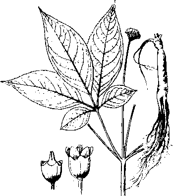 Panax ginseng C.A.Mey.,五加科,人参属。多年生草本。生于落叶阔叶林或针叶阔叶混交林下。分布于辽宁东部、吉林东半部和黑龙江东部,河北、山西有引种;俄罗斯和朝鲜也有分布,并多栽培。主根肥大肉质,纺锤形或圆柱形。地上茎单生,直立。掌状复叶,3~6枚轮生于茎顶,叶柄长,无托叶,小叶3~5枚;一年生幼苗仅1枚3小叶的复叶,二年生以上的茎生复叶有5枚小叶,小叶椭圆形至矩圆状椭圆形,有具尖刺的锯齿。淡黄绿色花瓣和雄蕊均5枚;子房下位,2室。果扁球形,鲜红色。种子肾形,乳白色。肉质根微甘,有特异香味,主要含人参皂苷,为著名强壮滋补中药材,能补气益血,生津安神,祛痰、健胃、利尿、兴奋,用于调整血压、恢复心脏、神经衰弱、糖尿病等症。