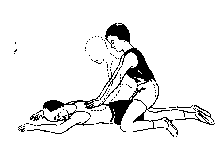 俯卧压背法 适用于溺水者的急救。具体方法是:病人俯卧,腹下垫枕或衣物,头转向一侧,一臂伸直,另一臂弯曲垫于头下。急救者跪跨在患者大腿两侧,将手放在其两侧背部下方,用力压迫后再放松。如此每分钟重复16—18次, 儿童18—20次 (图3)。