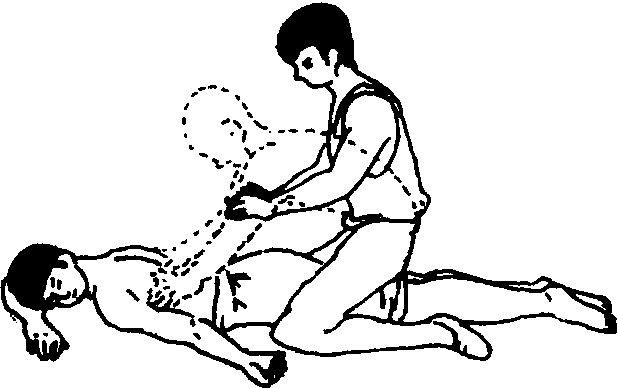 仰卧压胸法 适用于一般窒息患者, 而不适用于同时需要作心脏按摩或胸部有外伤的患者。具体方法是:患者仰卧, 腰背部垫枕或衣物使胸部抬高, 上肢放在身体两侧,头转向一侧。急救者跪跨在患者大腿两侧,两手掌贴在其两侧下胸部,向斜后上方用力将气体挤出肺脏,然后放松让胸廓自行弹回而吸入空气。如此有节奏地按压, 每分钟16—18次, 儿童18—20次 (图2)。