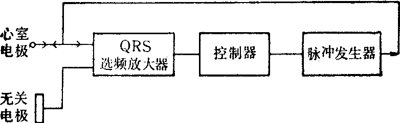 (3) 心室同步型起搏器:是使用单极心室电极,并兼有感知QRS波和刺激心室的双重功能。原理方框图如图2所示。当心脏有自身心搏发生时,起搏器能自动安排脉冲发放程序,避免刺激脉冲与自身心搏的竞争。这类起搏器可分为心室触发型待用起搏器和心室抑制型按需起搏器两种。