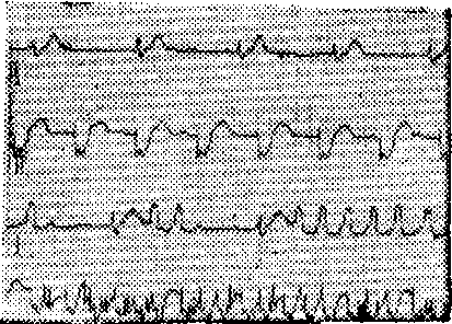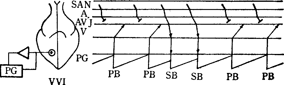 (2) 非同步型起搏的心电图波形: 起搏脉冲信号按时出现,紧接出现P′波(心房起搏时)或畸形QRS波群(心室起搏时),如有过早搏动或其他自发心搏出现,则起搏脉冲信号将落在P波或QRS波群之后,心房或心室的不应期中而成为无效刺激(见“人工心脏起搏器”条图1)。