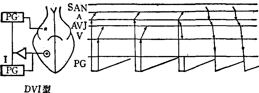 DVI和DDD型起搏器的核心部分是两个相关脉冲发生器,先后按一定时序发放起搏脉冲,一为SA (心房起搏脉冲),另一为SV(心室起搏脉冲),使房室顺序应激而同步收缩。它们的工作过程与正常的心脏活动相近似,因而被称之为生理型双腔起搏器,它不但可以提高心搏出量(15%~30%),而且不存在心室起搏的弊端:心室到心房的逆传导和起搏综合征——由心室起搏而引起的血压降低及头晕等症状。