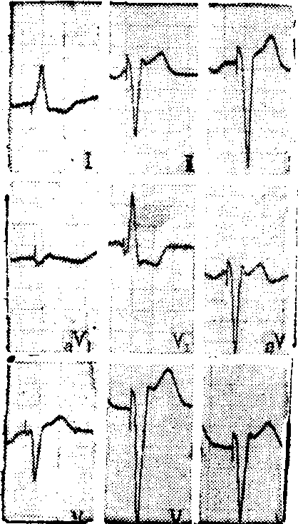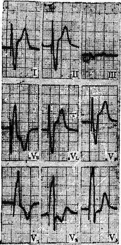 图示心室起搏的QRS波群之后,由于激动逆向传入心房而出现倒置的P′波 (R-P′间期0.48s),P′波之后又出现QRS波群(P′-R间期0.12s),在Ⅱ、Ⅲ导联最清楚。