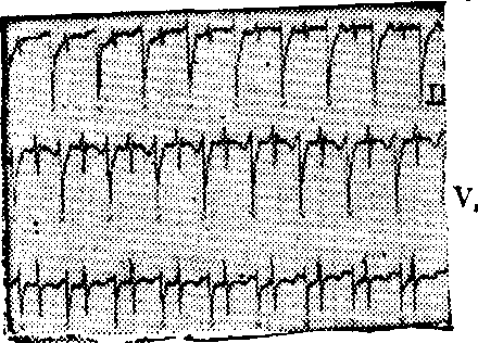 ❷反复心律和反复心动过速:心室起搏的QRS波群之后,由于激动逆向传入心房而出现倒置的P′波,心房激动又向前传到心室引起心室激动,P′波之后又出现QRS波群,是为反复心律,后者往复循环可形成反复心动过速(图5)。