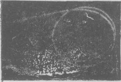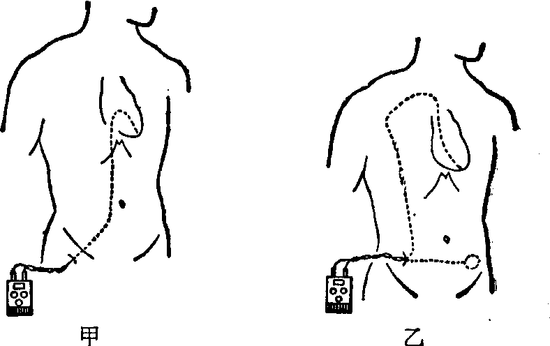 图2 体外携带式起搏器应用示意 甲: 临时起搏; 乙: 永久起搏。 (2) 体内埋藏式起搏器: 应用时置于病人体内,其脉冲发生器和电池一起用环氧树脂包埋或再加封金属外壳,故能长期置于人体内。目前所用的体内埋藏式起搏器都属小型,重量<150g,体积<60cm3,与电极导线联接后一起埋在病人胸部或腹部皮下。其优点是病人皮肤愈合后无创面,继发感染机会少,目前被广泛用于永久起搏。其缺点是起搏器发生故障时,需要施行手术才能排除,而且由于电池容量的限制,使用年数有限 (图3),到时需施行手术更换起搏器和电池。 (3) 半埋藏式起搏器: 亦称感应式起搏器。应用时电极导线和脉冲接收线圈埋于病人体内,后者多置于胸部皮下组织。脉冲发生器和电池置于体外,起搏脉冲通过置于皮肤表面的脉冲发射线圈而发放,由与之相对合的脉冲接收线圈感应后传递到心肌。其优点是体内部件埋置后无创面,继发感染机会少,脉冲发生器置于体外可以随时调整各项指标和更换电池。但因其只能作非同步起搏,故目前应用不广(图4)。