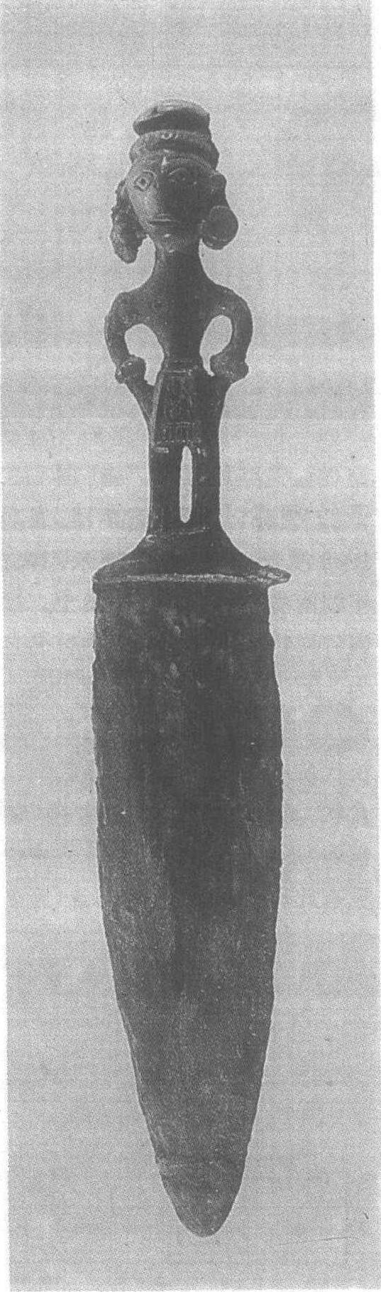 | 释义 | 人形柄铜匕首 人形柄铜匕首战国。匕首,近身刺杀的武器。通长20厘米,刃宽3.5厘米,柄长8.6厘米。1974年湖南省长沙市树木岭出土。湖南省博物馆藏。此匕首之柄作立人形。大眼,高鼻梁,头上有圆饰形发髻,后垂长辫至肩部,耳上有粗大的耳坠;两手叉于臀部,手指伸开,袖子在手腕处打结;胸部露出乳房,腰间系短裙,上有尖角形和条形图案;两足并立,脚趾分开。从形象看当属于古代南方的少数民族。发型服饰都值得研究,是一件珍贵的艺术品。