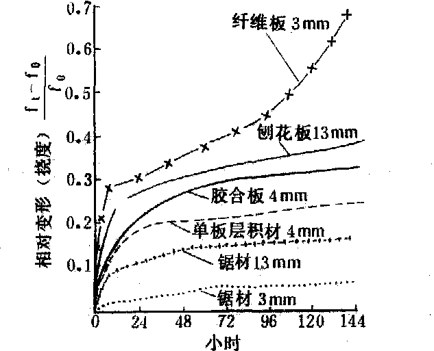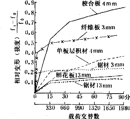 图2 锯材及人造板各板种的静载蠕变量(用40%静曲载荷) 影响蠕变性质的几个因素 在人造板中,细木工板和单板层积材的蠕变量最小。然后,按蠕变大小顺序为胶合板、刨花板、纤维板。图2仅为一参考实例。在某些情况下,其顺序不一定如此。图3为另一参考实例,是人造板的动载蠕变。由于载荷量取断裂载荷的60%,在这种高载荷作用下,锯材、单板层积材、胶合板内结构很快受到损伤,就出现图3所示现象。