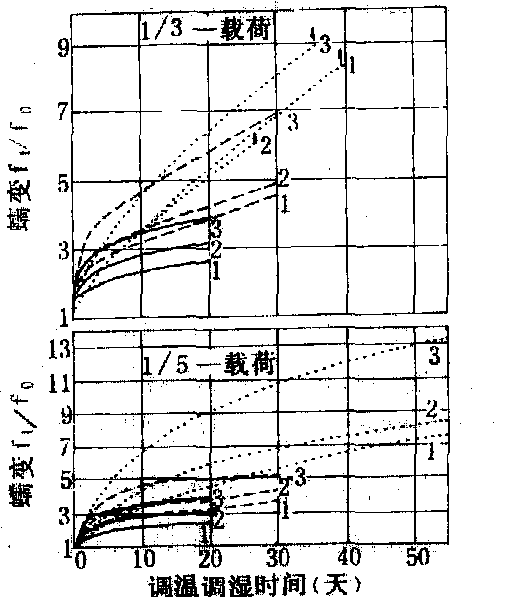 图3 锯材及人造板各板种的动载蠕变量(用60%的动载荷) 人造板含水率及温度对蠕变性能有显著的影响。一般木制品在含水率为15%时的蠕变量,是含水率6%时的10倍。图4表示了刨花板当含水率以及含水率及湿度同时变化时的蠕变量。当恒定载荷达破裂载荷1/3,人造板的含水率及湿度同时变化时,受载到28~42天达到疲劳极限而破坏。 不同胶种的人造板之间蠕变性质也有差别。酚醛胶人造板虽然耐气候性很强,但其蠕变量却大于脲醛人造板(图4)。
