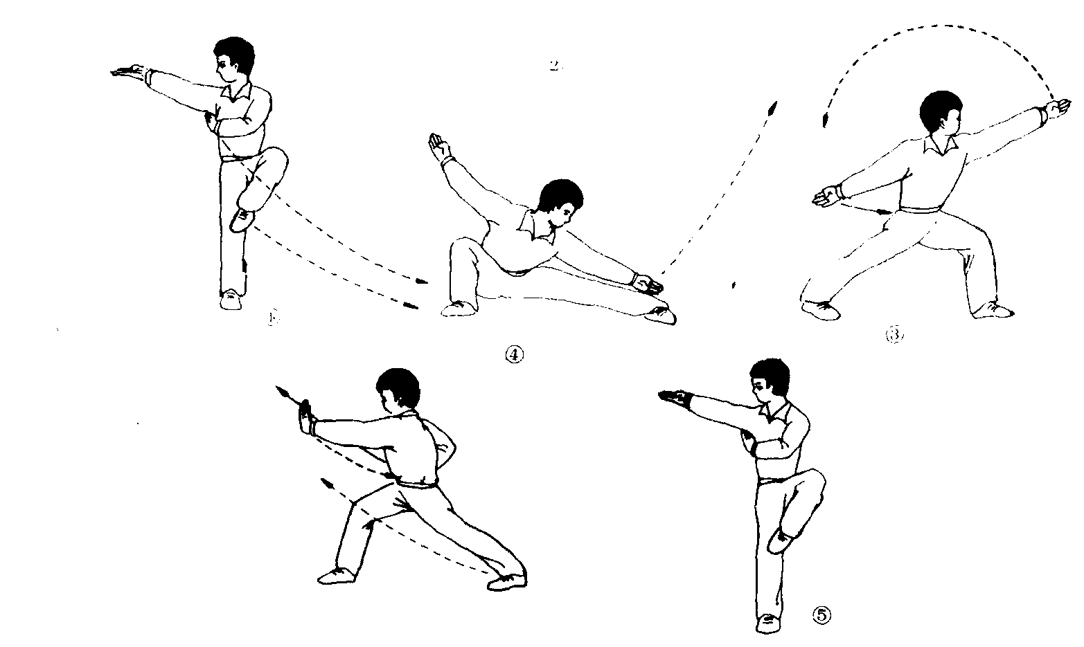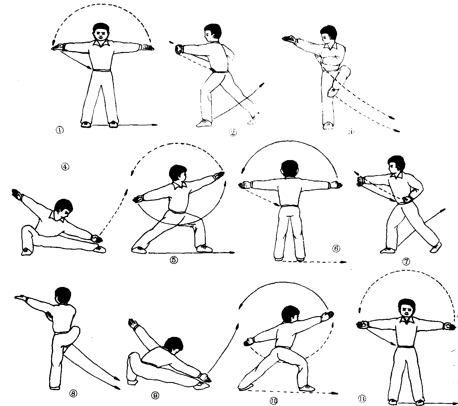 ❿弓步挑掌;(11)上左脚的同时两臂抡转成背面侧平举。如此反复练习。