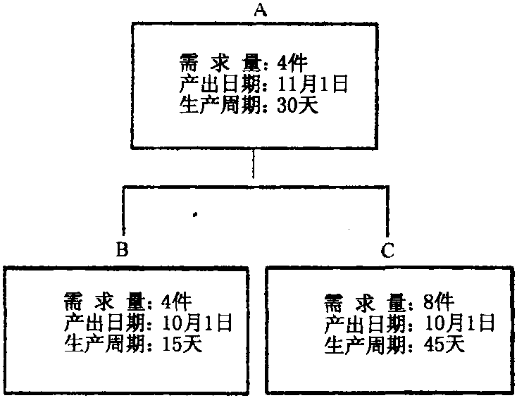 与其他需求之间有内在相关性的需求项目的存储系统。这种需求可以由其他物料推算得到,因而对它的存储可以进行确定型的控制。比如用户订货对企业来说是独立需求,但这项订货产品所需要的一切零部件、原材料,不但投入产出的数量可以确定下来,就连时间也随之确定了,因而称零部件、原材料为从属需求。图8-17是产品A的装配结构图,B和C的数量及投入时间由产品A决定,所以称B和C为从属需求。括号内的数字表示1件产品A所需要的B和C的数量。B和C的时间、数量确定方法如图8-18所示(其中生产周期可以从生产的定额资料中查到)。用同样方法可以求出B和C的所有下层零部件的投入时间和数量。