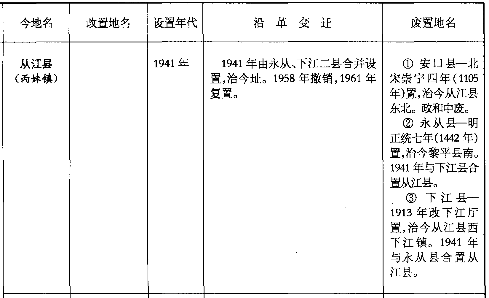 从江县(丙妹镇)1941年1941年由永从、下江二县合并设置,治今址。1958年撤销,1961年复置。❶ 安口县—北宋崇宁四年(1105年)置,治今从江县东北。政和中废。❷ 永从县—明正统七年(1442年)置,治今黎平县南。1941年与下江县合置从江县。❸ 下江县—1913年改下江厅置,治今从江县西下江镇。1941年与永从县合置从江县。