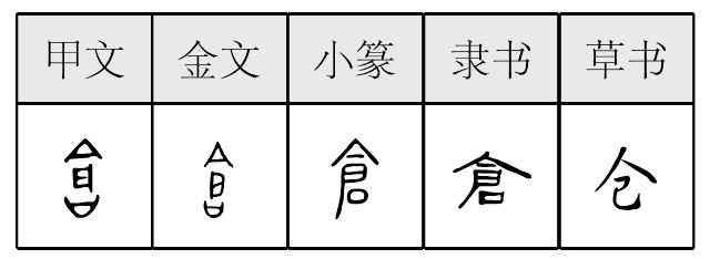 cānɡ象形,甲骨文、金文象粮仓形,中有仓门。(一说表意,从合从户,表示仓廪有门可入。)小篆字形稍变,隶定为“倉”。本义为粮仓,收藏谷物的处所,引申为仓库,储藏各种物资的建筑物或处所。《简化字表》参考清代俗字简作“仓”。 【辨析】 ❶以“仓”作音符构成的形声字读音不同。cānɡ:苍、舱、沧、伧∣chuānɡ:疮∣chuànɡ:创、怆∣qiānɡ:枪、呛、戗∣qiǎnɡ:抢∣qiànɡ:炝、跄。 ❷“仓(倉)”可作类推简化偏旁使用,如:创(創)、枪(槍)、疮(瘡)。 |