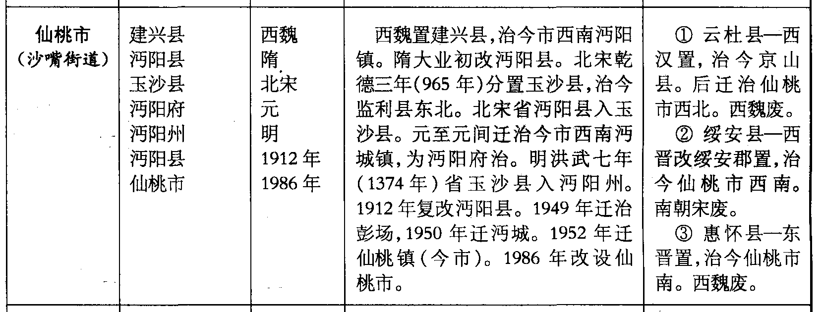 西魏置建兴县,治今市西南沔阳镇。隋大业初改沔阳县。北宋乾德三年(965年)分置玉沙县,治今监利县东北。北宋省沔阳县入玉沙县。元至元间迁治今市西南沔城镇,为沔阳府治。明洪武七年(1374年)省玉沙县入沔阳州。1912年复改沔阳县。1949年迁治彭场,1950年迁沔城。1952年迁仙桃镇(今市)。1986年改设仙桃市。