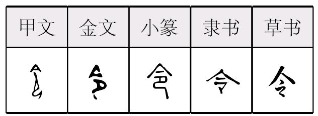 令 甲骨文; 金文; 篆lìng,lǐng,líng[亽(像人張口發號令,省去人體,意符)+卩(像人跽跪形,意符)→令(《説文》:“令,發號也。從亼卪。”令,像一人發號令,另一人恭聽。1.lìng,會意爲令〈命令〉。引申爲“使”,如:侯寶林的相聲令人發笑。時節〈夏令〉。因爲時節像“命令”一樣,不可以違背。美好〈令名〉。敬辞,用于称对方的親屬〈令尊、令郎〉。2.lǐng,紙張計量單位,原張的紙五百張爲一令;3.líng,令狐,古地名,在今山西臨猗一帶。)] 《詩經·邶風·凱風》:“母氏聖善,我無令人。”(親娘德高又賢慧,生我兄弟無所爲。) 《論語·子路》:“子曰:‘其身正,不令而行;其身不正,雖令不從。’”(孔子説:“當官的,本身正,不下命令,百姓也會照做,自身不正,雖然下令,老百姓也不會服從。) 令令(5画) ❶líng ❷lǐng ❸lìng