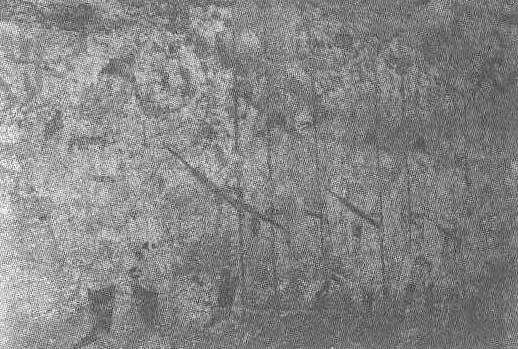 唐贞观十七年(公元643年)。纵135厘米。陕西省礼泉县烟霞乡陵光村唐昭陵长乐公主墓墓道西壁壁画。1986年发掘。图中共绘八人,服饰相同,皆戴黑色幞头,外着浅色敞襟短袖风衣,风衣内系黑腰带,脚穿尖头高筒黑靴,腰佩剑。第一人身材高大魁伟,与其他人拉开距离。其余七人手持五旒旗散列其后,第一面旗上绘一黑色飞鸟。一行八人,威武严肃,但又各具自己独有的神态。