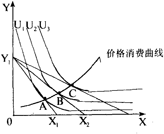 由于商品价格的变动而引起消费者满足极大化的商品组合点发生变化的轨迹。这些商品组合点的轨迹可用图形显示。图中X、Y轴分别为两种商品X和Y的购买量,Y商品的价格保持不变,X商品价格连续下降,致使消费者预算线从Y1X1推至Y1X2和Y1X3,结果消费者满足极大化的点从A点推至B点和C点,把A,B,C等满足极大化的点相连,得到价格消费曲线。
