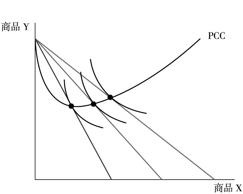 在其他商品的价格水平、消费者收入水平、消费者偏好不变的情况下,一种商品价格变动所对应的商品最佳购买组合点组成的轨迹。一种商品价格的变化,会影响到预算线的变化,在不同预算线下确定一个效用最大化的商品组合,即预算线与无差异曲线的切点,这些点描述出来的曲线就是价格消费曲线(见下图)。
