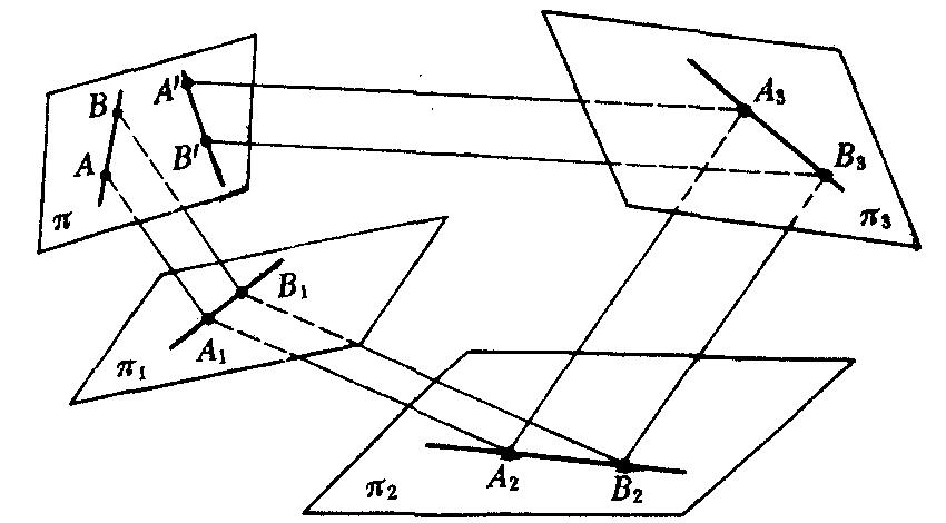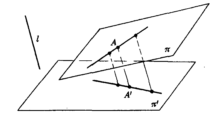 例如,在两个平面π和π′,一直线l与π,π′都不平行.在平面π上任取一点A,过点A作直线l的平行线,交平面π′于点A′,则点A′是平面π上的点A在平面π′上的平行投影(图1).平面π上各点,经过一系列的平行投影后变到π自身(图2),这就是一个平面π到它自身的一个仿射变换.