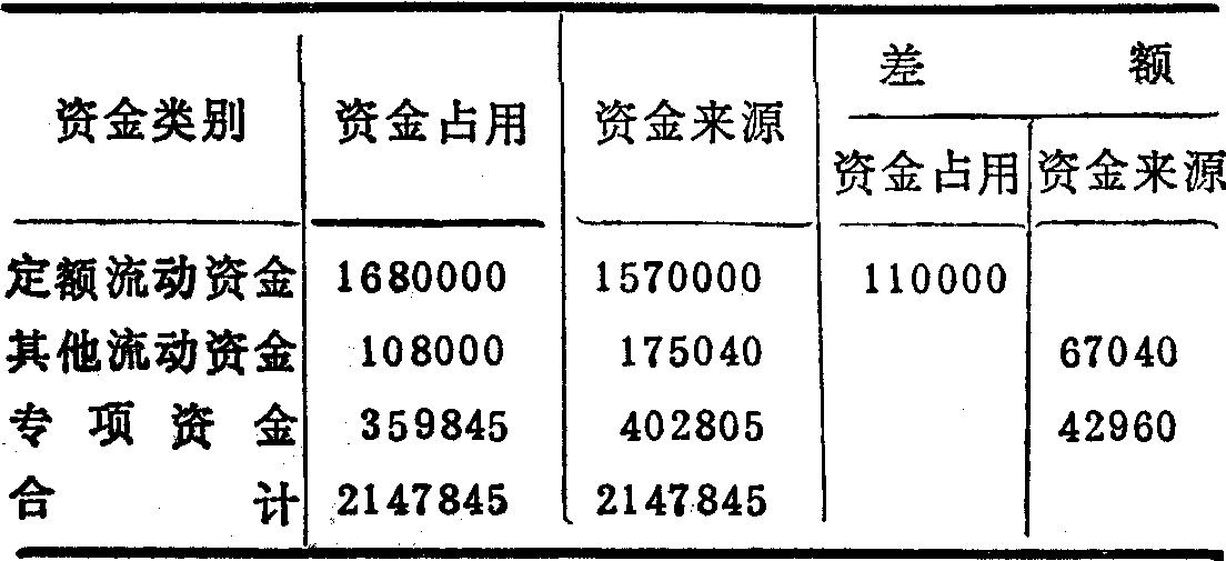 上表说明,定额流动资金占用其他资金来源110000元,其中占用非定额流动资金67040元,占用专项资金42960元。 支付能力与支付需要是相对的。企业的支付能力还应从现有支付能力和近期获得的支付能力两方面看。现有支付能力虽大,而近期支付能力不足,加在一起满足不了近期的支付需要,不能认为有足够的支付能力;反之,现有支付能力虽不足,但近期支付能力较强,加在一起,可以满足近期的支付需要,应认为有足够的支付能力。现有的支付能力主要指现有的结算户存款。近期支付能力则要从定额流动资产和其他流动资产中可以“变现”的项目分析计算。近期支付需要包括:应付购货款、其他应付款中的应付工资和应交工会经费,应交未交的利润、税金、折旧基金等项。支付能力与支付需要的比较,可根据“资金平衡表”有关项目及明细帐资料,列表如下: